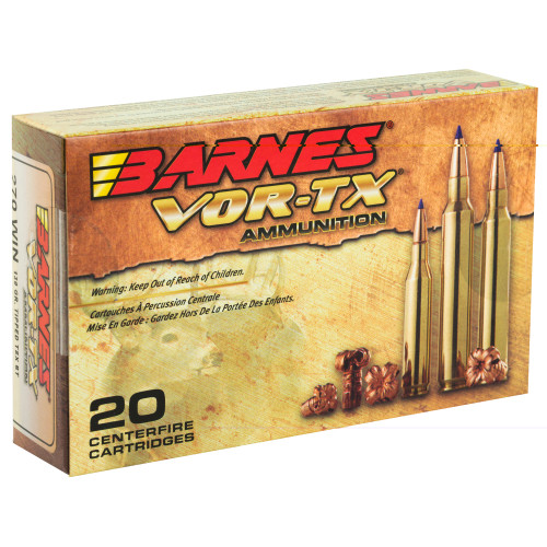 Barnes(R) VOR-TX(R) is precision ammunition loaded with the deadliest bullets on the planet. Barnes, the leader in bullet innovation offers hunters the ultimate in accuracy, terminal performance and handloaded precision in a factory loaded round. Offering double-diameter expansion, maximum weight retention and excellent accuracy, the TSX(R), Tipped TSX(TM), and TSX FN(TM) provide devastating energy transfer. Multiple grooves in the bullets shank reduce pressure and improve accuracy. Bullets open instantly on contact - no other bullet expands as quickly. Nose peels back into four sharp-edged copper petals.