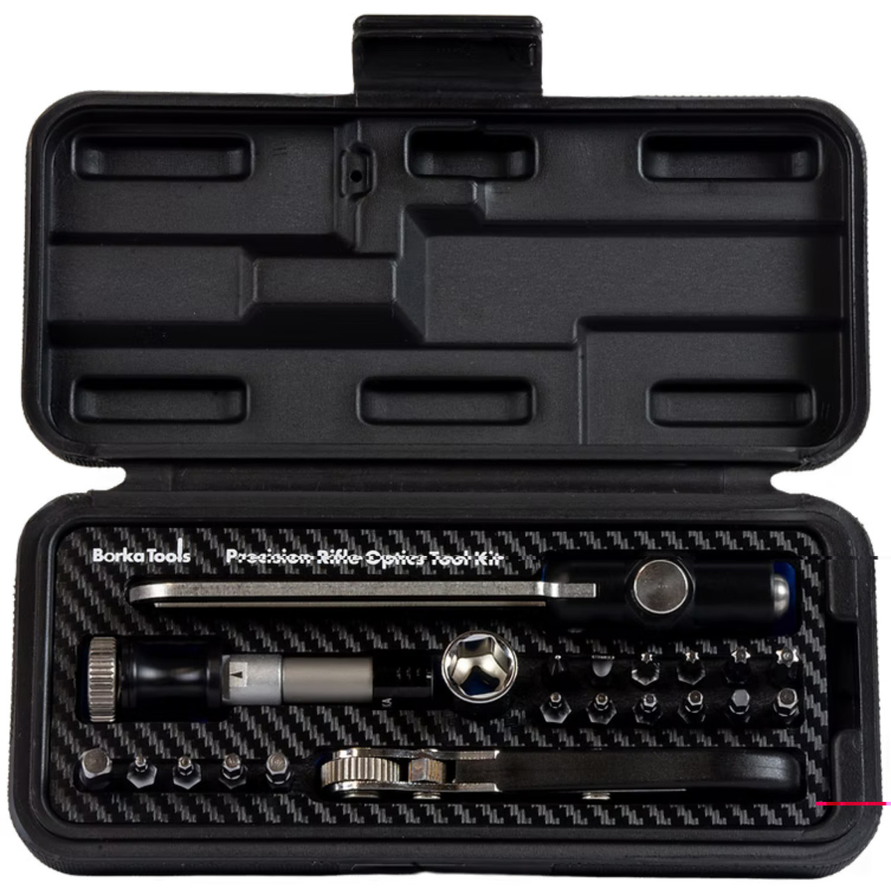 The BorkaTools PROTK Precision Rifle & Optics Tool Kit with the BTD10-70IP American-made, 10-70 in-lbs. adjustable torque driver gives you repeatable, field-ready torque control for scope rings, mounts, action screws and more.