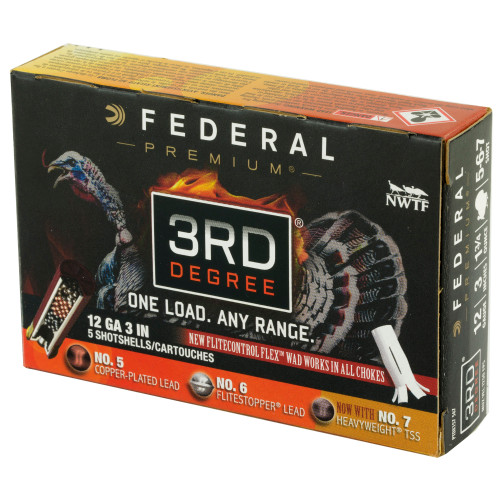 Federal Premium 3rd Degree has redefined turkey shotshell performance once again with the addition of the FLITECONTROL FLEX wad. The system performs through both standard and ported turkey chokes, opening from the rear and staying with the shot column longer for full consistent patterns. Rather than simply pattern tightly like conventional loads, 3rd Degree uses a three-stage payload consisting of No. 5 copper-plated lead, No. 6 FLITESTOPPER lead and now No. 7 HEAVYWEIGHT TSS shot to deliver larger, more forgiving patterns at close range while still providing deadly performance at long distance.