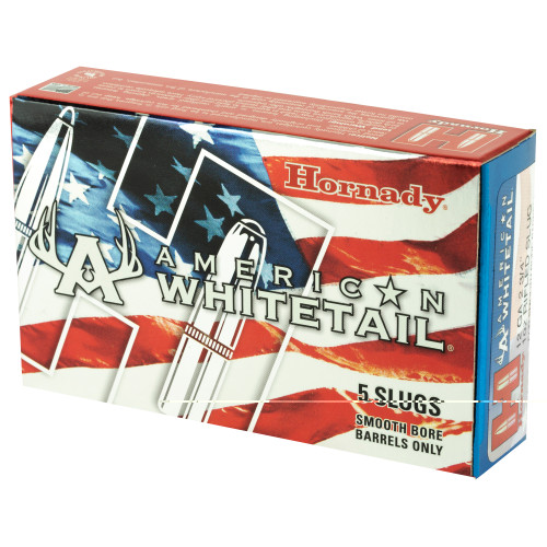 Designed for smooth-bore barrels, Hornady American Whitetail Rifled Slugs are loaded with a 1-ounce foster style slug. The hollow point style slug features a tough, lead alloy core loaded to 1,600 feet per second. The compression style wad protects the slug at ignition and helps to seal the bore for maximum velocity.