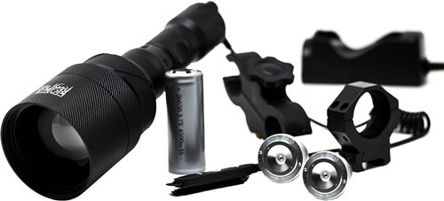 Other Features: Up to 700 yards of beam throw adjustable focus remote switch rail mount uni scope mount rechargeable 26650 battery wall charger interchangeable red and green led's.Waterproof.7 hours of burn time.Carry case.